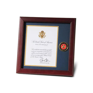 U.S. Flag Store's U.S. Marine Corps Medallion Presidential Memorial Certificate Frame is designed to hold a single 8-Inch by 10-Inch Presidential Memorial Certificate. The certificate is set into a double layer of Marine Blue matting with Gold trim. The frame is made from Mahogany colored wood, and the outside dimensions measure 14-Inches by 14-Inches.