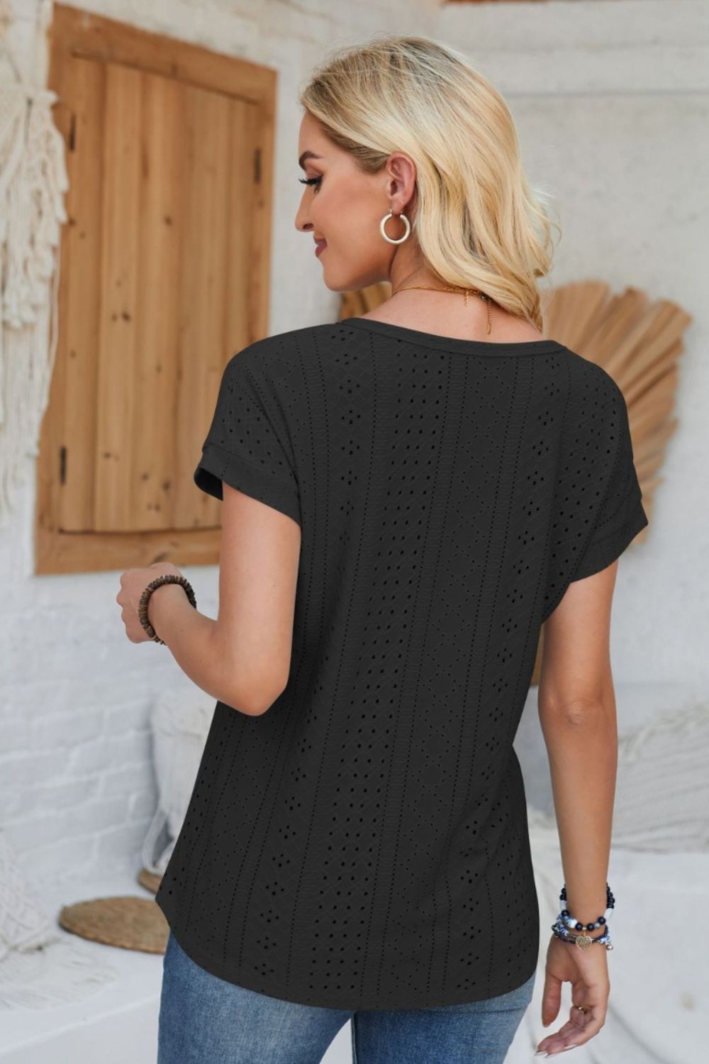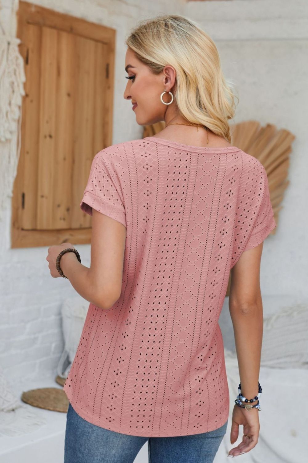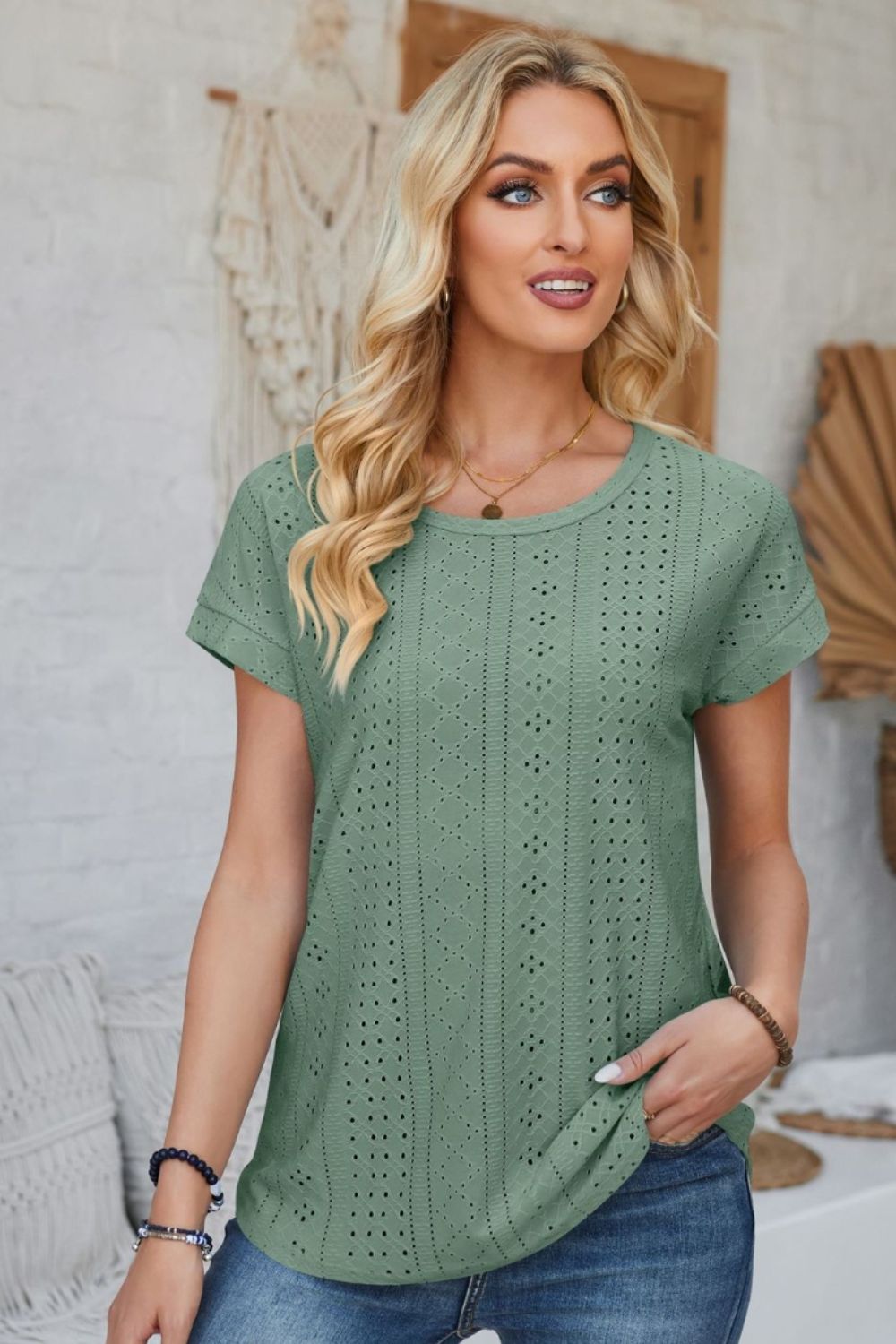 Eyelet Round Neck Rolled Short Sleeve T-Shirt
