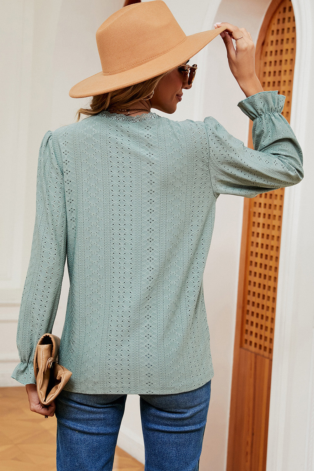 Eyelet V-Neck Flounce Sleeve T-Shirt