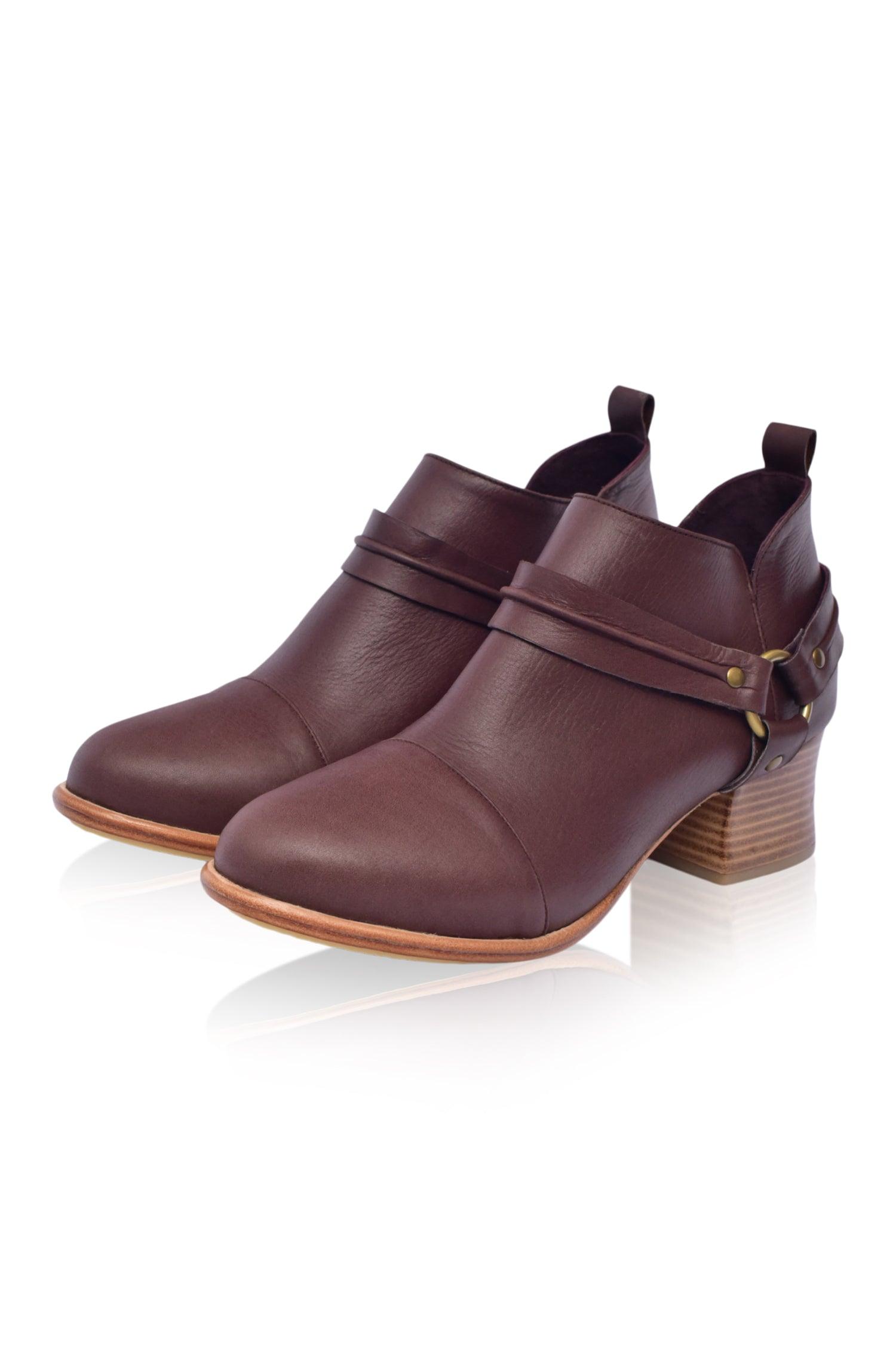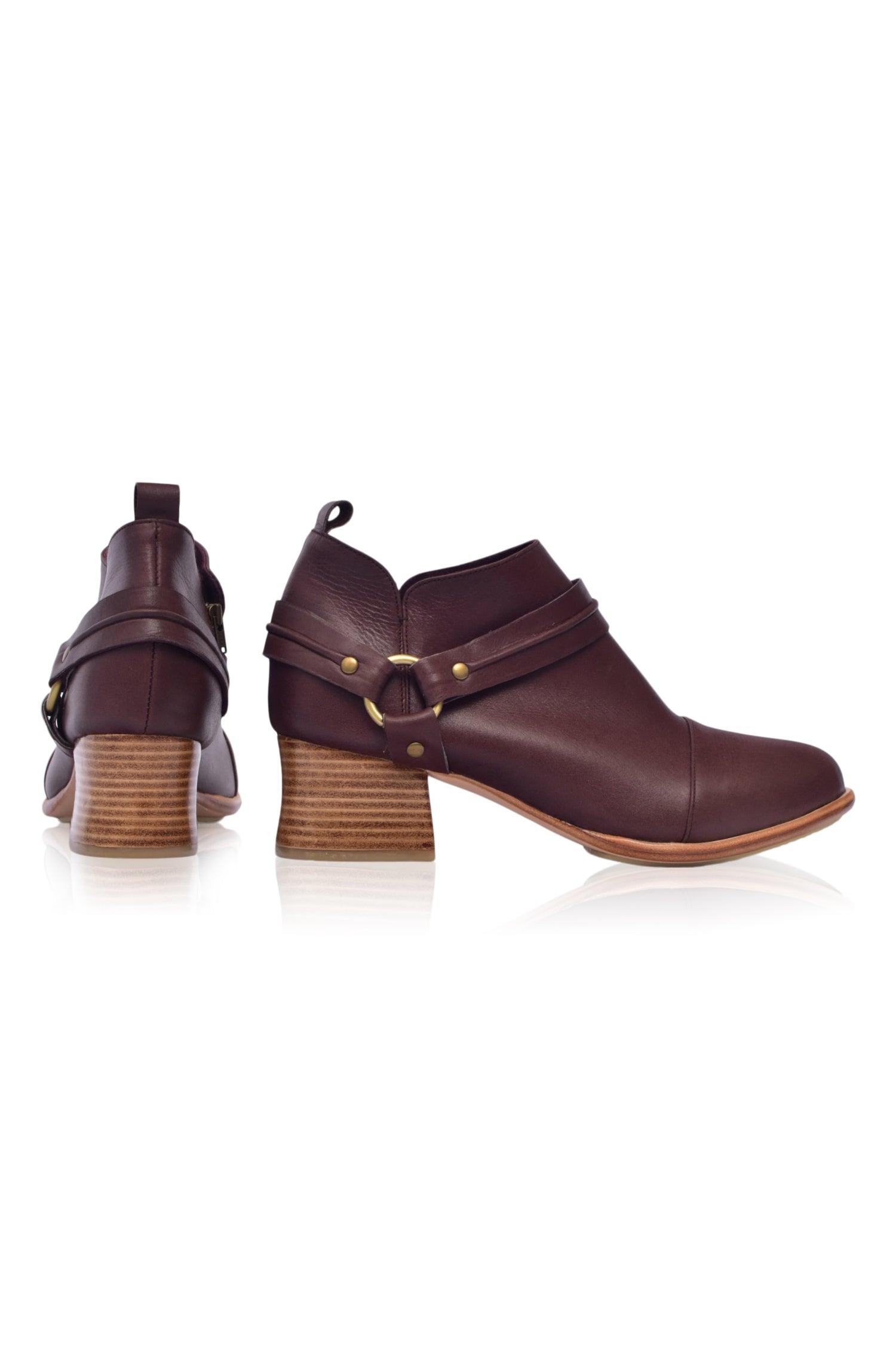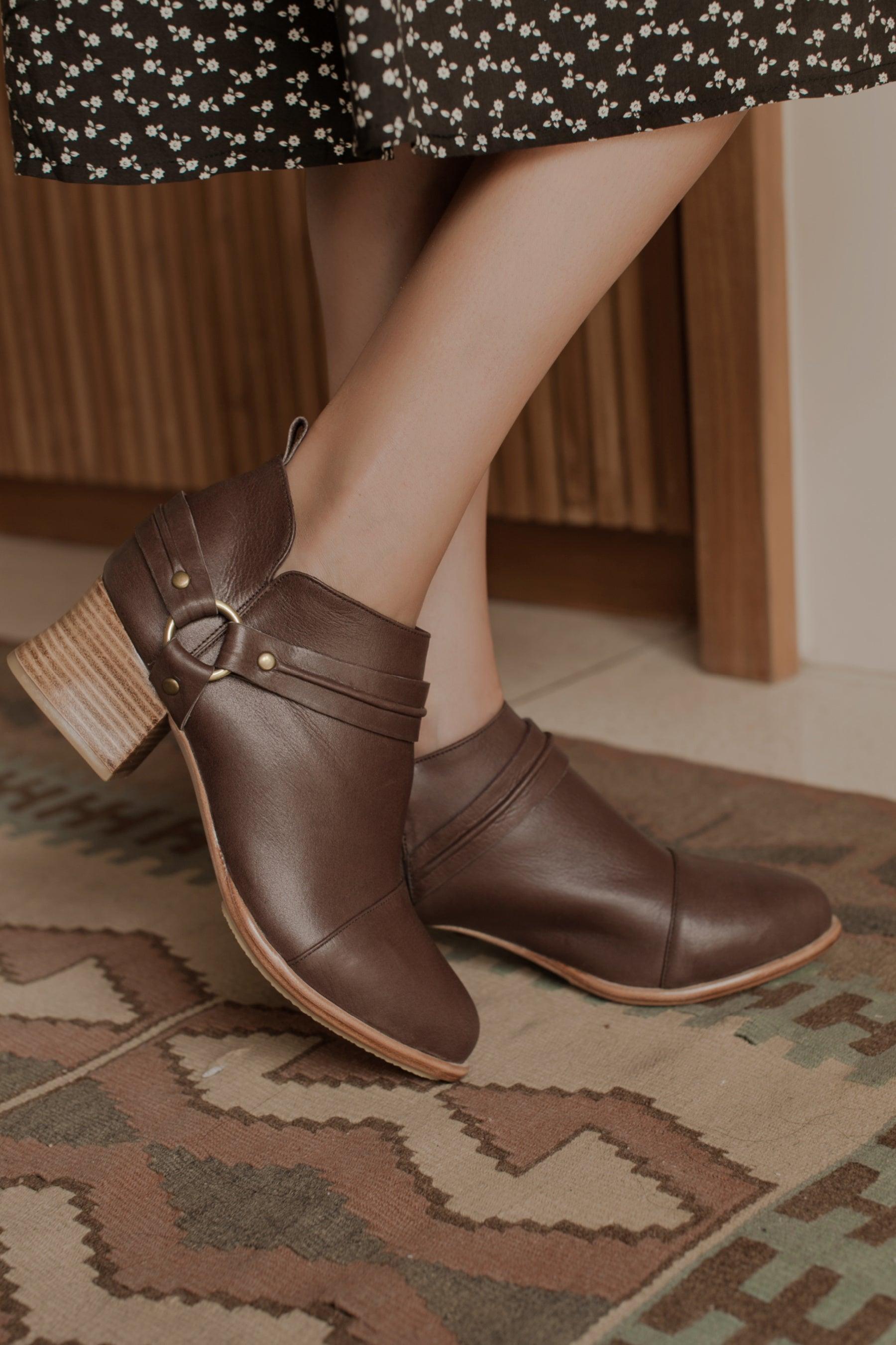 Slip into comfortable Western inspired handmade Dasha booties that are ideal for all day walking. Featuring wild-west strap detailing these leather boots are designed with the heel height that is just enough to make you feel stylish and comfortable when strolling through the city.