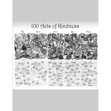 100 Acts of Kindness is the record of making a collaboration woodcut print among 100 artists from all over the world. Content includes an explanation of the project, pictures of each panel, each artist contribution and their comments, history of previous projects, how to make a puzzle print and more. A Puzzle Print is a large design composed of "puzzle pieces", each of which is designed and carved by a unique artist under a common theme, in this case Kindness. The project director designs and cuts the wood block into puzzle-like pieces, then sends the pieces to participant artists; they carve their own small design and send the tiny piece back. Then the director assembles the carved pieces. The entire design is printed as a woodcut print and each artist receives a large print with all the contributions.Print Title: 100 Acts of Kindness: Monumental Collaborative Puzzle Print #6Project Director: Maria Arango Diener 1000woodcuts@gmail.comProject Dates: February 2020 to February 2021Artists: 100 artists listed followingType of Print: Woodcut Puzzle PrintSize: 30 inches high (76 cm) by 110 inches wide (280 cm)Paper: Rising Stonehenge Ivory, 5 sheets 22 x 30 (56 x 76 cm) inches eachBlock: Cherry Plywood, 5 blocks 22 x 30 inches (56 x 76 cm), cut into 100 irregular puzzle pieces approximately 4-6 inches (10-15 cm) in diameterInk: Gamblin Portland Black, Graphic Chemical Perfect Palette Black and Tom Huck's Intense Black Oil Based ReliefEdition: First edition 100 print sets of eight prints each, untitled, unnumbered, unsigned, stamped on back with Project Seal. Print sets distributed to participants.Printed in 1000 Woodcuts studio and DD Studio in Las Vegas Nevada USA by the Project Director and the Print Elf.