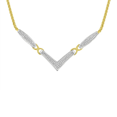 This stunning 14K yellow and white gold pendant necklace features flared rectangle shapes followed by X-shaped links sandwiching a flared V shaped centerpiece. Both the rectangles and the V shaped segments are inset with two rows of invisible set princess cut diamonds set in 14K white gold while the X shaped links are made of 14K yellow gold. The necklace has a wide franco chain with a lobster claw clasp. The contemporary yet classic 18" necklace complements any neckline beautifully. This authentic design is crafted of real 14 karat gold, a precious metal that will keep a tarnish-free shine for years to come. This sweet necklace makes a great gift for any special occasion! Whether worn for daytime glamour or evening sparkle, this necklace is gorgeously versatile. Coordinate it with your favorite diamond earrings or other diamond jewelry to create a complete and elegant ensemble. It's a classic and feminine piece she'll want to show off every day.