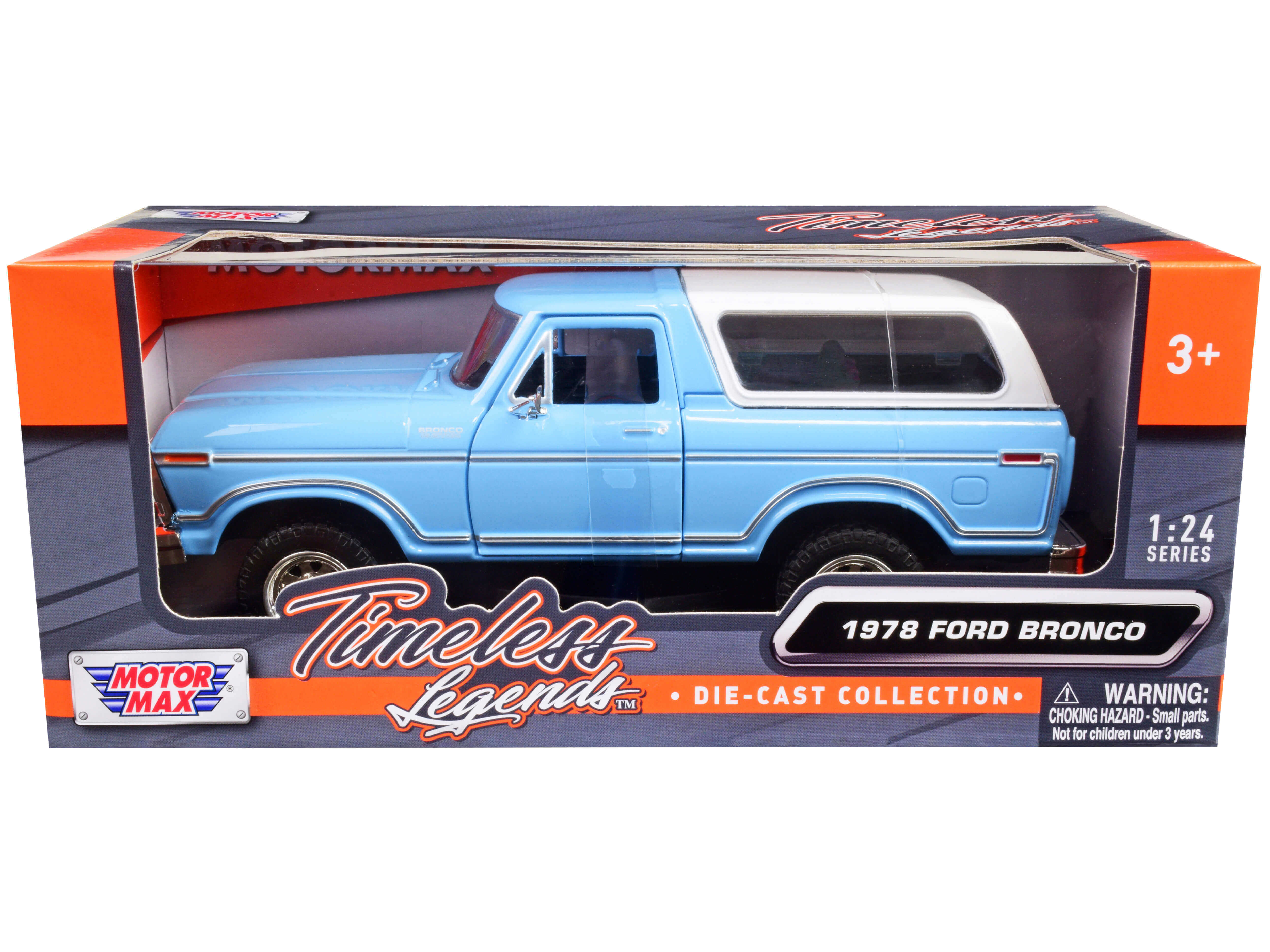 - Brand new 1/24 scale diecast car model of 1978 Ford Bronco Custom Light Blue and White "Timeless Legends" Series die cast model car by Motormax.