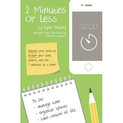 Whether you are the CEO of a company, student entering college, small business owner, empty-nester, or homemaker, you will find value in these pages. The guiding principle in this book is very simple to follow. Some of the ideas will resonate with you, but more importantly, they will prompt you to think about your schedule, spaces, and what you value. This book could be the inspiration you need to establish a simple, yet life changing habit that will give you more time to do what you really enjoy. Lynn Reding brings her years of experience as a professional organizer to you as she offers her insight into ways you can more easily manage your time and spaces. Follow the simple principles in "2 Minutes Or Less" and you WILL reduce stress. Many of her clients say that this approach has changed their lives by helping them get their smallest tasks done immediately and painlessly. Simplify your life when you learn to: -Make the most out of even a few seconds -Use simple technology to your advantage -Apply Lynn's "clean as you go" principle The rewards can be immediate, transforming, and permanent.