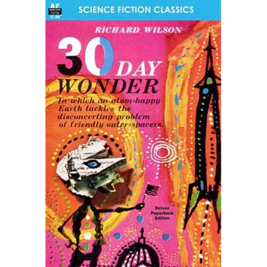 Armchair fiction presents extra large paperback editions of the best in classic science fiction novels. "30 Day Wonder" is a great tale in which Aliens comically invade Earth, written by science fiction specialist, Richard Wilson The story revolves around a reporter-a good one-who's an average guy with a sense of humor and reasonable views about the rights of his fellow man. Maybe that's why the Monolithians picked him to head up their public-relations program. After all, they had to reach a lot of average people and even though they were invulnerable, they couldn't afford to take chances. Because they had a message, and EVERYBODY had to be convinced. So he didn't have any choice in the matter...That's where the system went wrong...no choice. Act peaceful. Love thy neighbor. Obey the law. Why, people could go mad living that way. And many would.