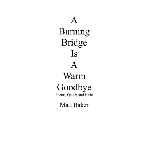 A Burning Bridge is a warm Goodbye is a collection of poems, thoughts and short stories amassed during Baker's turbulent time traveling between the U.S. and Canada. Finally landing in the states and going from couches to beds to week long drinking binges. Baker taps into the raw, harsh reality of truly seeing the elegance and splendor of Hell and "her". Often relating the two. His honesty is jarring and humorous. So, grab the cat, grab the wine and enjoy.