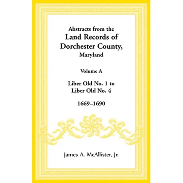 In 1960 James A. McAllister, Jr. began the series, "Abstracts from the Land Records of Dorchester County Maryland". We have reprinted his works (each volume containing 3 or more of McAllister's books) with the cooperation of the Dorchester County Historical Society, from 1669 (in Vol. A) up to and including 1801 (in Vol. L). These abstracted records often reveal names of wives, sons, daughters, and other relationships. Included with the deeds are abstracts of land commissions that re-established the boundaries of land tracts at the request of a new owner. These hearings consisted of depositions of persons knowledgeable of the original markers. The individuals gave not only their knowledge of the history of the boundary markers of the tract of land in question but their own ages, and other bits of information. For research of families in Dorchester County, which has such a dearth of early material, the land records are a must. Fortunately the abstracts were done with care and a keen knowledge of the records. Each volume is indexed.