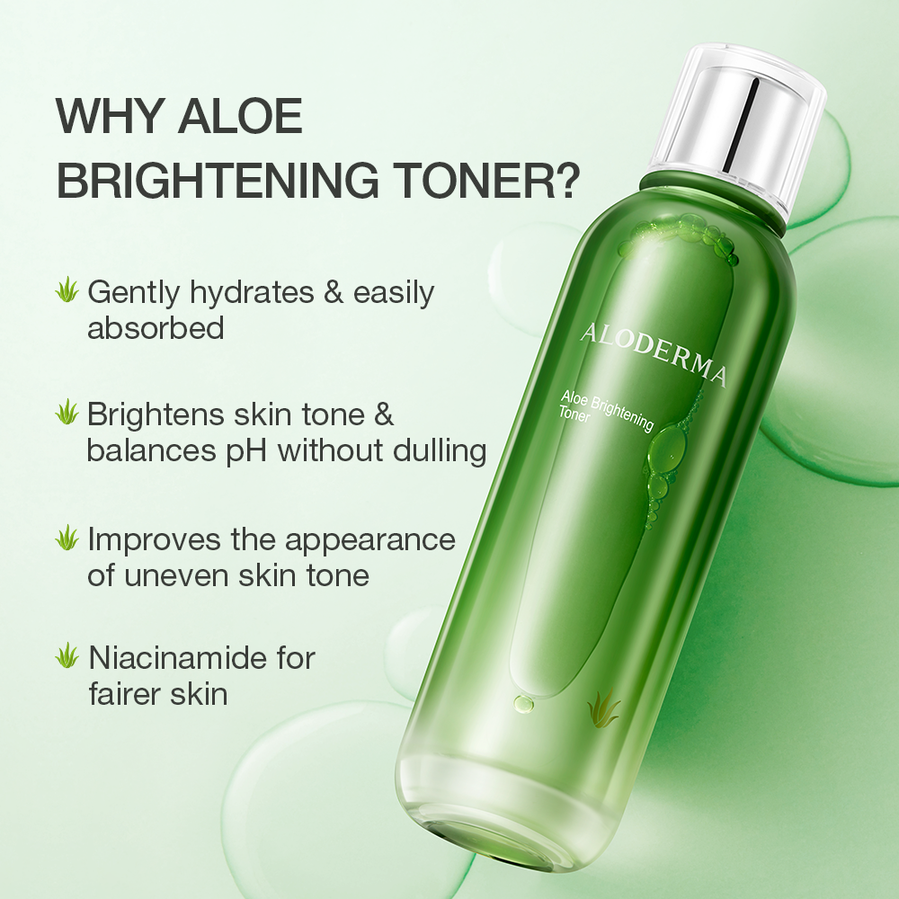 Unleash Your Skin's Inner Glow. Restore a radiant, even-toned complexion with ALODERMA's Aloe Brightening Toner, a refreshing formula crafted with over 95% natural ingredients, including our star ingredient: fresh, organic aloe vera. This potent toner delivers a surge of hydration and essential nutrients to visibly brighten and revitalize your skin.