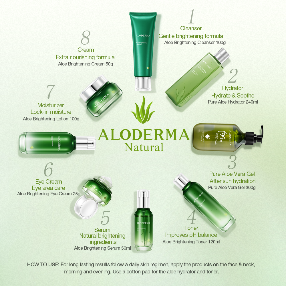 - Utilizing a proprietary Aloe Vera processing technology, all ALODERMA skin care products capture the active nutrients of fresh Aloe Vera – hydrating, brightening, soothing, smoothing, tightening, and rejuvenating the appearance of skin. With over 230 nutrients, the juice found inside Aloe Vera captures the power of nature to repair and nourish skin. ALODERMA helps you achieve amazing beauty through the natural power of Aloe Vera.