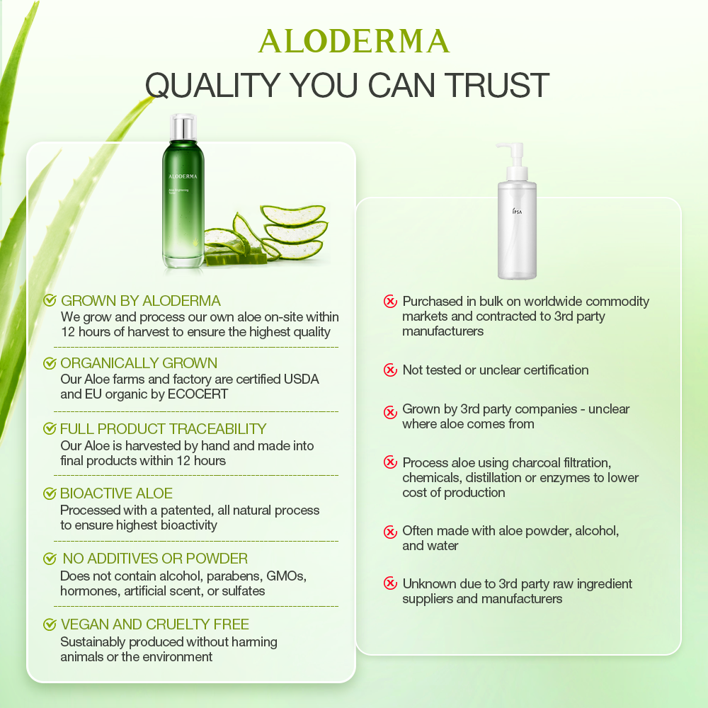 - ALODERMA products are formulated with the highest quality, organic aloe vera, grown and processed on-site at our farms within 12 hours of harvest. This ensures that our products capture the full potency and efficacy of fresh aloe vera. We use a proprietary aloe processing technology to preserve all the active nutrients of the aloe vera plant, delivering the best possible results for your skin.