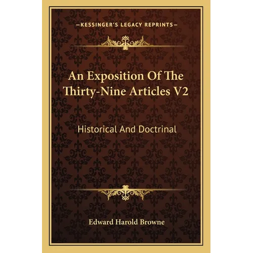 ""An Exposition of the Thirty-Nine Articles V2: Historical and Doctrinal"" is a book written by Edward Harold Browne that provides a detailed analysis and explanation of the Thirty-Nine Articles, which are a set of statements of belief used in the Church of England. The book is divided into two parts: the first part focuses on the historical background and development of the Articles, while the second part delves into the doctrinal implications of each Article. Browne's work is considered a seminal text in the study of Anglican theology, and has been praised for its thoroughness and clarity. The book is aimed at scholars, theologians, and anyone interested in the history and theology of the Church of England. It provides a comprehensive overview of the Thirty-Nine Articles, their origins, and their significance in the Anglican tradition. Overall, ""An Exposition of the Thirty-Nine Articles V2: Historical and Doctrinal"" is a valuable resource for anyone seeking to deepen their understanding of Anglican theology and the Church of England's beliefs.In Two Volumes. Being The Substance Of A Course Of Lectures Delivered To Candidates For Orders At St. David�������s College, Lampeter.This scarce antiquarian book is a facsimile reprint of the old original and may contain some imperfections such as library marks and notations. Because we believe this work is culturally important, we have made it available as part of our commitment for protecting, preserving, and promoting the world's literature in affordable, high quality, modern editions, that are true to their original work.