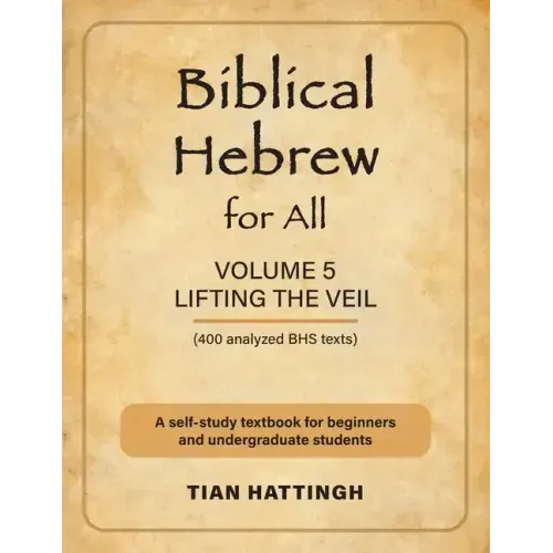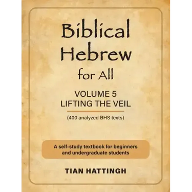 Biblical Hebrew for All: (Lifting the Veil) - Volume 5, is intended as a self-study textbook which literally 'lifts the veil' in that it comprises 'a selection of 400 passages from the Hebrew Bible, all fully explained and literally translated to illustrate the fact that a basic knowledge of Biblical Hebrew will enable the reader to compliment any standard English translation and discover much more from the original text'.