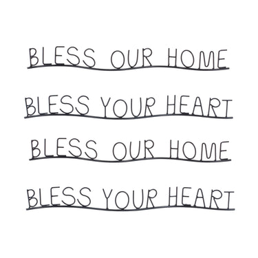 Welcome your guests with love and warmth through the Bless Our Home and Heart Sentiment Metal Decor set. Crafted with a classic black finish, this collection brings a modern touch to your entryway or living room. Featuring heartfelt messages that read "Bless our Home" and "Bless your Heart," this decor is a perfect way to share positivity and make a lasting impression. Made from high-quality metal, these pieces are designed to withstand the seasons, offering both style and durability for years to come. Sold in a set of four pieces with two assorted designs to create a meaningful display in your home.