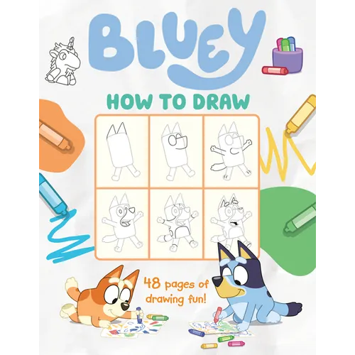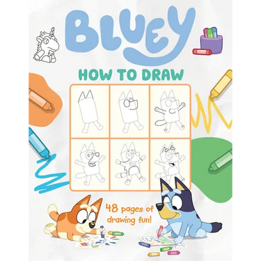 Draw the Heelers, the Grannies, and all your favorite Bluey characters! This how-to-draw book features 48 pages of step-by-step instructions for drawing everyone from the world of Bluey. Perfect for rainy days, road trips, and more!
