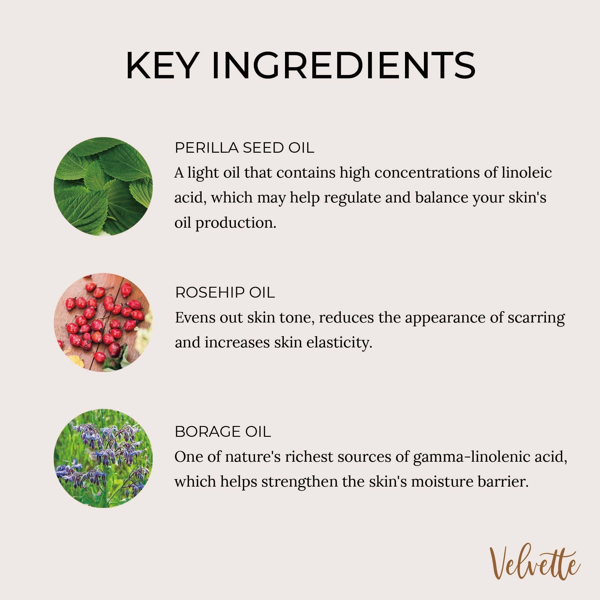 For combination or blemish-prone skin, Velvette Clarifying Face Oil (Day) is made with gentle, all-natural, and quick-absorbing organic plant oils like rosehip, perilla, and borage. This light face oil won’t clog pores and provides just the right amount of moisture for smooth, clearer-looking skin.