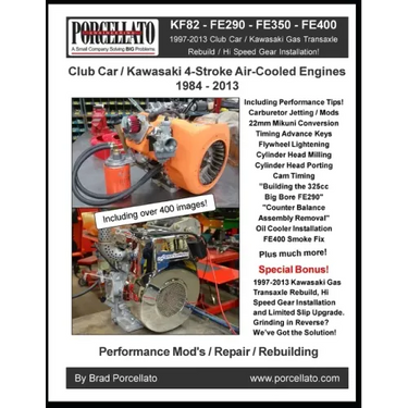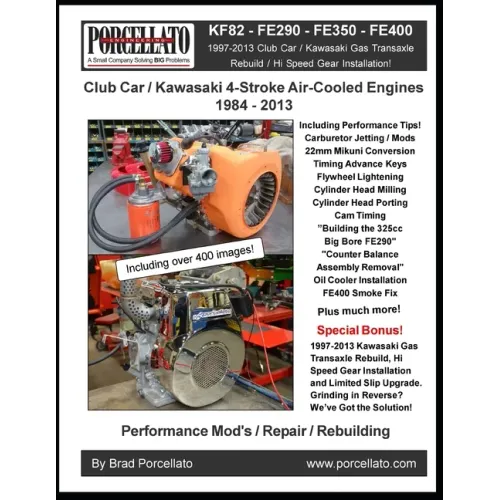 Includes: Tool List, General Information, Engine Rotation (CW vs CCW), Engine Disassembly FE Series, FE Series Torque and Bore Specs, FE Series Performance - Jetting, 22mm Mikuni, Timing Advance Keys, Flywheel Lightening, Cylinder Head Milling, Porting, Cam Timing, Building the 325cc Big Bore FE290 and CW Removal. FE Series Repairs - Remote Oil Cooler, Bolted Cam Gear, FE400 Smoke fix, Exhaust Guide Repair, Link Arm Bushing Replacement, Cylinder Assembly and Piston Orientation. FE Series Assembly, KF82 General Information - KF82 Torque Specs, KF82 Disassembly, KF82 Measurement / Inspection, KF82 Assembly, KF82 Pictures for Reference, KF82 / FE290 - FE400 Ignition Testing, KF82 / FE290 - FE400 Parts Reference, 1997-2013 Club Car Gas Transaxle, 1997-2013 CC Gas / Type K HS Gear Installation, 1997-2013 CC Gas / Type K Posi Shims, 1997-13 CC Gas Transaxle Pictures for Reference and more Also includes: 1997-2013 Club Car / Kawasaki Gas Transaxle Rebuild / Hi Speed Gear Installation
