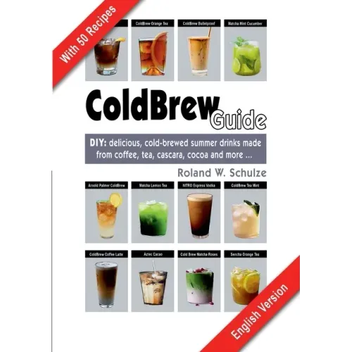 ColdBrew, what is it? Unlike the normal coffee preparation with hot water, for this brewing method cold water is used. This is the cognac-coloured liquid that the Dutch merchants had already discovered in the 17th century. ColdBrew originated as a coffee extract that can be diluted with water as a basis for mixed drinks or cocktails. The aromatic substances released in the cold water have a truly distinctive and indeed much richer taste than cooled, originally hot-brewed coffee. It is possible to brew both green tea and cascara (the dried pulp of the coffee fruit) cold, as well as exquisite cacao nibs. This makes very delicious basis for summer cocktails, both with and without alcohol. With this book, we would like to introduce you to 50 of the best and most tempting, easy to prepare, summer drinks. In addition, we provide a lot of useful information about the pleasures of drinking, ice-cube creations, drinking rituals and the appropriate types of drinking glasses. Experience an extraordinary and creative taste sensation!
