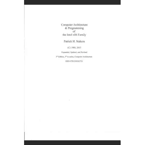 This book is an introduction to computer architecture, hardware and software, presented in the context of the Intel x86 family. The x86 describes not only a line of microprocessor chips dating back to 1978, but also an instruction set architecture (ISA) that the chips implement. The chip families were built by Intel and other manufacturers, and execute the same instructions, but in different manners. The results are the same, arithmetically and logically, but may differ in their timing. Why the focus on the Intel x86? It was the basis of the IBM personal computer (PC) family and its spin-offs. It has transitioned from a 16 to a 32 to a 64-bit architecture, keeping compatibility for more than 30 years. It's an de-facto industry standard that has withstood the test of time. This book covers the Intel ISA-16 and ISA-32 architectures from the 8086/8088 to the Pentium, including the math coprocessors. A chart of ISA processors is included. The purpose of this book is to provide the basic background information for an understanding of the 80x86 family, the IBM Personal Computer (pc), and programming in assembly language as an introduction to the broader field of Computer Architecture. It will stress the pervasiveness of this pc-based technology in everyday things and events. It will provide an introduction to Software System Engineering and the Design for Debugging methodology. This book is a spin-off of a course in Computer Architecture/System Integration, taught in the graduate Engineering Science Program at Loyola College (now, Loyola University in Maryland). If we learn to program in the language c, for example, we can take our skills to any computer with a set of c-based tools. If we learn IA-32 assembly language, we have to relearn a language if we switch to a different architecture. So, why do we learn assembly language? Because it gives us insight into the underlying hardware, how it is organized, and how it operates. This book is dedicated to the graduate students in Engineering Science at Loyola College, Columbia Campus, who took the course EG-611, "System Integration I, the x86 Architecture and Assembly Language." The course was given to hundreds of students over a span of 15 years by myself and others. An Extensive bibliography is provided. Table of Contents Introduction Definitions Technological & Economic Impact Limitations of the technology Number Systems Computer Instruction Set Architecture Prefixes Position notation Infinities, overflows, and underflows Hexadecimal numbers Elementary Math operations Base conversion Logical operations on data Math in terms of logic functions Negative numbers Data structures Integers BCD Format ASCII Format Parity Lists Hardware Elements of a Computer The Central Processing Unit The fetch/execute cycle X86 Processor family Input/Output I/O Methods Polled I/O Interrupt DMA Serial versus parallel Memory Memory organization and addressing Caches Memory Management Software Elements of a Computer Instruction Set Architecture (ISA) of the 80x86 Family Programmers model of the x86 Assembly Language The compilation process Operating system: what it is; what it does The Intel x86 instruction set Stack Protocols Basic Math Operations Logical operations BCD Operations 64 Operations on STRINGS of data Shifts/rotates Multiply Divide Faster Math Interrupt architecture Pseudo operations Labels Addressing modes on the 8086 Effective Address Calculation Memory Segments Code addressing modes Data Addressing Modes Program Flow Subroutines Macro Modular design X86 Boot sequence The 8086 reset The BIOS ROM CPUid instruction Load