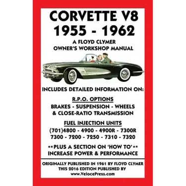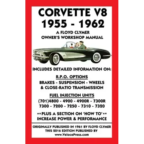 348 pages, with more than 200 illustrations and charts, size 5.5 x 8.5 inches. Originally published under the same title by Floyd Clymer in 1961 this revised edition was republished in 2015 by VelocePress. Written in easy to understand language, this is possibly the most user-friendly and comprehensive owner's workshop manual ever published for first generation 283 cu. in. V8 powered Corvettes. There are detailed instructions for the overhaul, service and maintenance of the major mechanical and electrical components. A section on RPO's identifies each option by part number, and their installation and effects on performance are discussed. In addition, there is a comprehensive section on the various fuel injection systems fitted to this series of Corvettes. Finally, there is a section on 'Increasing Power and Performance'. The reproduction of a factory handbook included in the original Clymer publication has been omitted due to the fact that there were numerous variations of the official Chevrolet handbook that were issued during the production run of this series of Corvettes. Therefore, it is recommended that this manual be used in conjunction with the 'Owners Handbook' that was issued with your automobile. Also, the 1960 AMA specifications have likewise been omitted as they are no longer relevant. Out-of-print and unavailable for many years, this book is becoming increasingly more difficult to find on the secondary market and we are pleased to be able to offer this reproduction as a service to all first generation Corvette owners, restorers and enthusiasts worldwide.