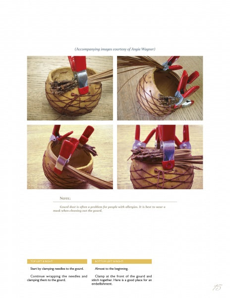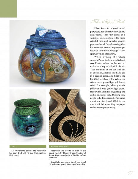In gourd art, there is a vast array of material that can be used when carving and decorating a gourd. When it comes to doing the rim, the options are just as varied. The best rims are those that complement the gourd's overall design. The rim "completes" the gourd--it makes the gourd look finished. Through more than 200 color images and tutorials from contributing artists, learn how to finish the rims of gourd bowls using chip stone, tubular beading, paper, coiling, leather, wire, clay, pine needle, and flowers. The rims illustrated range from the very simple to the extremely elaborate. A gallery of completed works will inspire your own creative ideas. This book is perfect for gourd artists of all skill levels.[AuthorName]Marianne Barnes[/AuthorName][AuthorBio]Marianne Barnes is a member of the American Gourd Society. She teaches gourd classes at John C Campbell, Belton Art Center, local patches, and national conventions. She has won many awards for her gourd art. She lives in South Carolina.[/AuthorBio][NumIllustration]205 color photos[/NumIllustration][CoAuthor][/CoAuthor][SubTitle][/SubTitle][ColorPattern]205 color photos[/ColorPattern]Free shipping on all U.S. orders
