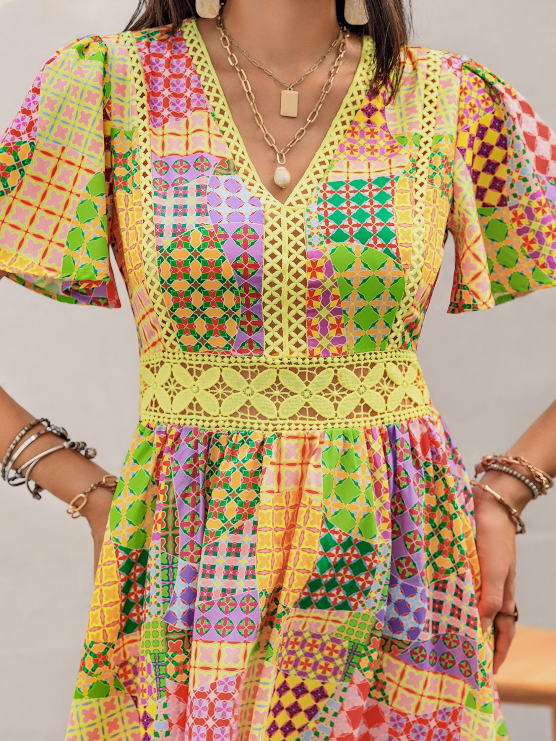 Crochet Trim Printed V-Neck Short Sleeve Mini Dress