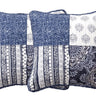 Enjoy our elegantly designed and classic boho designed cushion covers for a brightened look in any room. Our covers are accented with multiple floral paisley square patchworks all over in dark navy blue, lighter denim blue, white and grey shades.