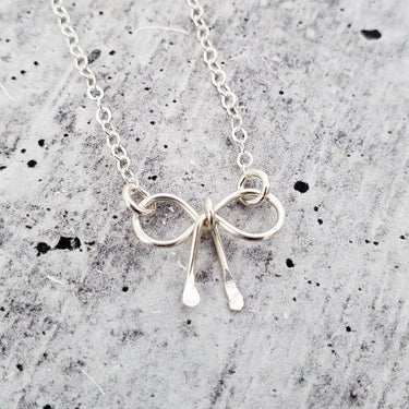 This is a beautiful, shiny hammered bow necklace made with your choice of sterling silver, 14k gold filled, or 14k rose gold filled. It's an adorable understated accessory to style up any outfit.