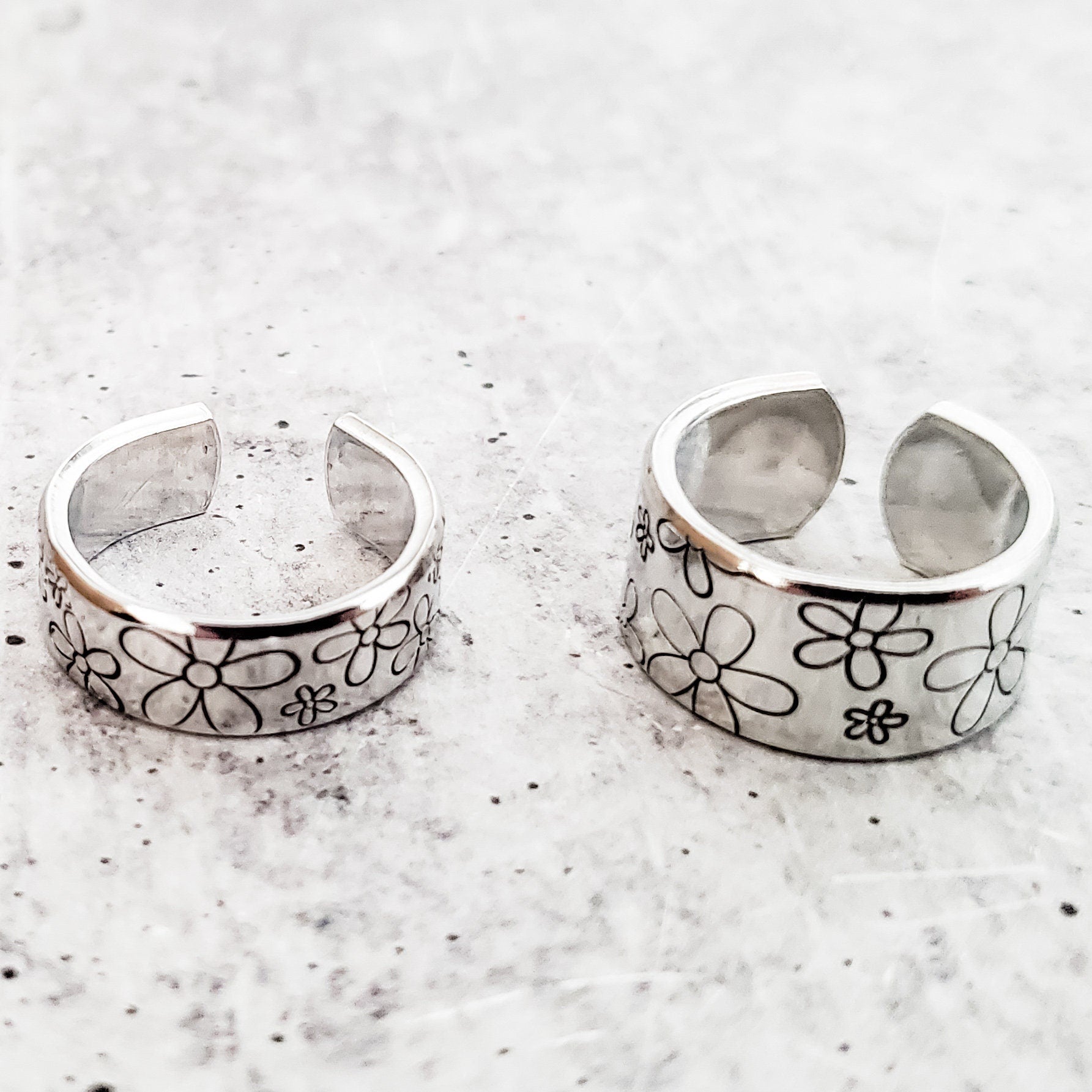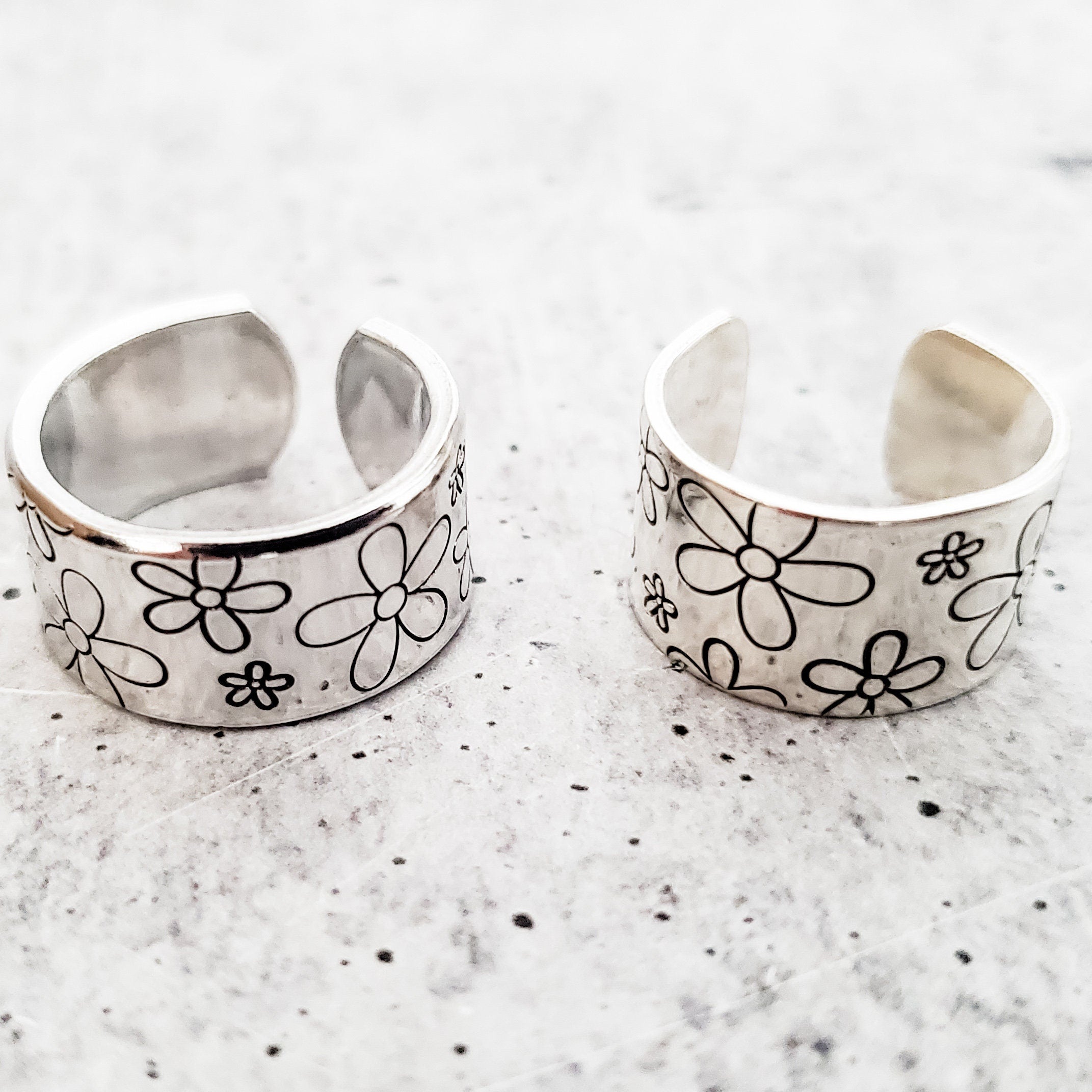 Step into a world of whimsical charm with the Aluminum or Sterling Silver Hand Stamped Wide Band Daisy Ring! This delightful piece of jewelry captures the essence of nature and infuses it with a playful twist. Get ready to adorn your finger with a daisy garden that will bring a smile to your face every time you glance down.