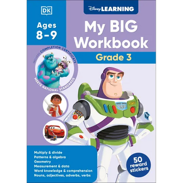 Get your child ready for Grade 3 math and English with Disney Learning: My Big Workbook Grade 3. Perfect for kids entering third grade, the fun, simple exercises make it easier than ever to boost understanding in vital school subjects, with review pages to help you track your child's progress. In this English and math workbook, children can complete activities to build on their basic school skills all year round. The easy directions and visual clues promote self-directed learning, while favorite Disney and Pixar characters join them every step of the way, inspiring them to excel during the school year - and beyond! This fun Grade 3 workbook for children offers:- Curriculum-aligned learning material that's been approved by educational experts, with clear leveling guidance to ensure your child is learning at the correct level