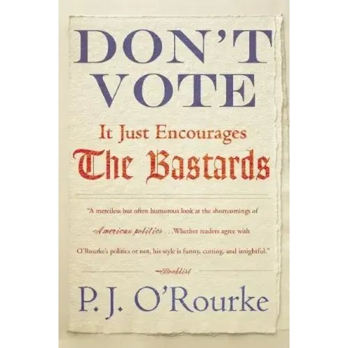 Having had a lot of fun with what politicians do, P.J. O'Rourke now has a lot of fun with what we should think about those politicians. Nothing good, to be sure. Best-selling humorist P.J. O'Rourke is back with his latest political masterpiece, Don't Vote--It Just Encourages The Bastards. Using his signature wit and keen observational skills, O'Rourke reflects on his forty year career as a political commentator, spanning his addlepated hippie youth to his current state of right-wing grouch maturity. Don't Vote--It Just Encourages The Bastards is a brilliant, disturbing, hilarious and sobering look at why politics and politicians are a necessary evil--but only just barely necessary. Read P.J. O'Rourke on the pathetic nature of politics and laugh through your tears or--what the hell--just laugh.