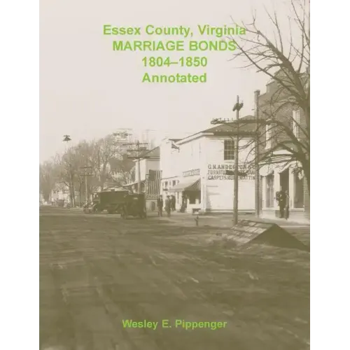 This work is a compilation of data found in 1,478 marriage bonds or consents of Essex County, Virginia, for the years 1804 through 1850. These are the earliest marriage records that survive for the county � those before were either burned or inadvertently destroyed. These original records are not generally served to researchers, rather researchers are directed to a bound Register of Marriages (Book One) that lists the bonds. Each entry references the page in this Register on which the information may be found. The most bonds were issued in 1835 (forty-seven) and 1827 (forty), with the other years averaging about thirty each. The fewest bonds are found for 1826 (seventeen).Individual entries in this work were derived primarily from marriage bonds and consents (by guardian or parent), and have been supplemented with data taken from outside sources such as: family Bible records, cemetery records, military records, and other publications. Not all entries contain information from outside sources. The format is two-fold: the first part of the paragraph is used for sequencing of the groom, and includes what data the compiler has found outside of the marriage record itself. Followed by this is the consolidated public marriage record (with the names of the bride and groom in capital letters), including the date of the marriage bond, and citing the main sources for the information used. The text is supplemented with nearly 900 footnotes by the compiler, an every-name index that contains over 9,000 entries, and a bibliography.