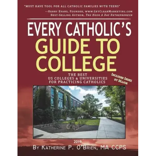 As a practicing Catholic and professional college planner, Katherine O'Brien MA, Founder of Celtic College Consultants, has compiled a college guide to meet the needs of practicing Catholics. In Every Catholic's Guide to College, 2019 she documents the colleges and universities across the country that have certain supports for Catholic student life on their campus. Today's parents need a guide to colleges and universities where their children can find a strong Catholic presence on campus. College is a time of growing and exploring intellectually. With a strong Catholic presence on campus, students can critically examine and deepen their faith. Catholicism has much to offer especially communion with God, who is love and mercy and the source of all hope, community, wisdom, and a stabilizing guide in life. The Guide includes detailed information about the best US colleges and universities for practicing Catholics, based on the availability of strong support for living and growing in faith on campus. Support includes the presence of a top ranked Newman Center or a Catholic dorm or FOCUS or St. Paul's outreach Catholic missionaries or being listed in the Newman Guide to Choosing a Catholic College. Each college's entry includes basic admissions criteria and financial aid information in addition to information on the academic programs offered and the research centers and institutes associated with the university. Making the Guide easy to use, the colleges and universities are listed in alphabetical order. The 2019 edition features an exhaustive guide by major is included near the front of the book. An index listing the schools by state and alphabetically are located at the back of the book. For each institution, the following information is listed: 1. Address, website, phone number 2. Number of undergraduate students, percentage male and female 3. In-state and Out-of-state costs, and % of financial need met, on average, for undergraduates 4. Athletic Division 5. Middle 50% range of SAT and ACT scores. 6. The kinds of degrees, colleges within the universities, undergraduate majors (for most schools), and research centers and institutes hosted by the institution While Every Catholic's Guide to College gives fairly complete information for hopeful undergraduates, aspiring graduate students will also benefit from using the Guide. Both undergraduate and graduate applicants interested in research and/or special topics within their field of study will be significantly aided by the inclusion of lists of research centers and institutes hosted by the colleges and universities. The Guide will serve Catholic families with a great starting point as they search for the best colleges for their children.