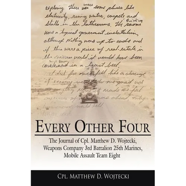 Every Other Four is a first hand account into the life of Cpl Wojtecki, A Marine Infantryman in Weapons Company 3/25 based out of Akron, OH. The day-by-day journal of the Marine describes what it felt like to be in some of the most hostile areas in the Al-An bar province and gives you the real story of what went on during those 10 months of training and combat. The 23-year-old college student describes life in a war-zone, constantly keeping watch on the roadways as a member of a Mobile Assault Platoon. Cpl. Wojtecki's platoon fought an ongoing battle against insurgents such as Zarkowi and the Mouja-Haadine terrorist group that planted IED's and mines on roadways, making it a difficult fight by blending into the local population and then fleeing to lawless river towns. This journal is dedicated to the 48 Marines and Sailors that died serving our country from 3/25. "Hopefully" he says, "the words in this journal will live forever and carry on their legacy."