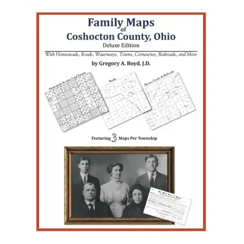 258 pages with 74 total maps Locating original landowners in maps has never been an easy task-until now. This volume in the Family Maps series contains newly created maps of original landowners (patent maps) in what is now Coshocton County, Ohio, gleaned from the indexes of the U.S. Bureau of Land Management. But it offers much more than that. For each township in the county, there are two additional maps accompanying the patent map: a road map and a map showing waterways, railroads, and both modern and many historical city-centers and cemeteries. Included are indexes to help you locate what you are looking for, whether you know a person's name, a last name, a place-name, or a cemetery. The combination of maps and indexes are designed to aid researchers of American history or genealogy to explore frontier neighborhoods, examine family migrations, locate hard-to-find cemeteries and towns, as well as locate land based on legal descriptions found in old documents or deeds. The patent-maps are essentially plat maps but instead of depicting owners for a particular year, these maps show original landowners, no matter when the transfer from the federal government was completed. Dates of patents typically begin near the time of statehood and run into the early 1900s. What's Mapped in this book (that you'll not likely find elsewhere) . . . 2199 Parcels of Land (with original landowner names and patent-dates labeled in the relevant map) 112 Cemeteries plus . . . Roads, and existing Rivers, Creeks, Streams, Railroads, and Small-towns (including some historical), etc. What YEARS are these maps for? Here are the counts for parcels of land mapped, by the decade in which the corresponding land patents were issued: DecadeParcel-count 1800s174 1810s90 1820s201 1830s1376 1840s315 1850s33 1860s6 1920s1 1930s1 1950s1 1970s1 What Cities and Towns are in Coshocton County, Ohio (and in this book)? Bacon, Bakersville, Blissfield, Blue Row, Bluff (historical), Canal Lewisville, Cavallo, Chili, Clark, Clowville (historical), Conesville, Cooperdale, Coshocton, Flat Iron Corner, Franklin, Fresno, Graham Corners, Hardscrabble, Helmick, Isleta, Keene, Layland, Linton Mills, Low Gap, Maysville, Metham, Mohawk Village, Morgan Run, Munsville (historical), Nellie, New Bedford, New Guilford, New Moscow, New Princeton, Newcastle, Orange, Owls Town (historical), Pearl, Plainfield, Pleasant Valley, Pleasantville (historical), Powell, Randle, Roscoe, Shady Bend, Spring Mountain, Stringtown (historical), Tiverton Center, Tunnel Hill, Tyndall, Tyrone, Wakatomika, Walhonding, Warsaw, Warsaw Junction, West Bedford, West Carlisle, West Lafayette, White Womans Town (historical), Willowbrook (historical), Wills Creek