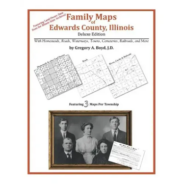 174 pages with 50 total maps Locating original landowners in maps has never been an easy task-until now. This volume in the Family Maps series contains newly created maps of original landowners (patent maps) in what is now Edwards County, Illinois, gleaned from the indexes of the Illinois State Archives. But it offers much more than that. For each township in the county, there are two additional maps accompanying the patent map: a road map and a map showing waterways, railroads, and both modern and many historical city-centers and cemeteries. Included are indexes to help you locate what you are looking for, whether you know a person's name, a last name, a place-name, or a cemetery. The combination of maps and indexes are designed to aid researchers of American history or genealogy to explore frontier neighborhoods, examine family migrations, locate hard-to-find cemeteries and towns, as well as locate land based on legal descriptions found in old documents or deeds. The patent-maps are essentially plat maps but instead of depicting owners for a particular year, these maps show original landowners, no matter when the transfer from the federal government was completed. Dates of patents typically begin near the time of statehood and run into the early 1900s. What's Mapped in this book (that you'll not likely find elsewhere) . . . 2497 Parcels of Land (with original landowner names and patent-dates labeled in the relevant map) 46 Cemeteries plus . . . Roads, and existing Rivers, Creeks, Streams, Railroads, and Small-towns (including some historical), etc. What YEARS are these maps for? Here are the counts for parcels of land mapped, by the decade in which the patent applications were made: DecadeParcel-count 1810s313 1820s31 1830s1080 1840s207 1850s829 1860s163 1870s26 What Cities and Towns are in Edwards County, Illinois (and in this book)? Albion, Bennington, Black, Bone Gap, Browns, Grayville, Lexington (historical), Maple Grove, Marion, Mills Prairie (historical), Piankashawtown (historical), Red Top, Samsville, Wanborough (historical), West Salem