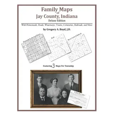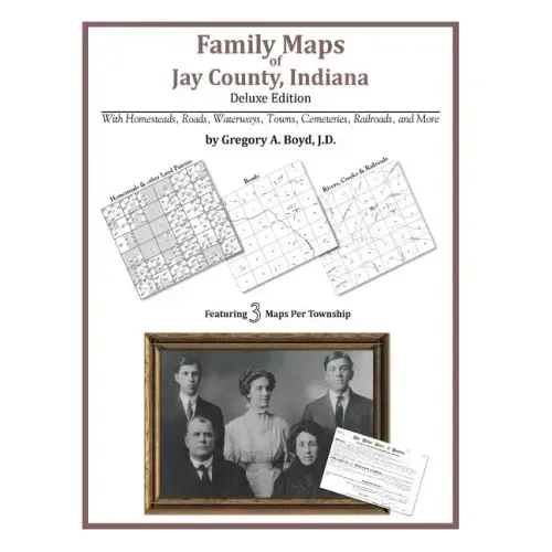 172 pages with 41 total maps Locating original landowners in maps has never been an easy task-until now. This volume in the Family Maps series contains newly created maps of original landowners (patent maps) in what is now Jay County, Indiana, gleaned from the indexes of the U.S. Bureau of Land Management. But it offers much more than that. For each township in the county, there are two additional maps accompanying the patent map: a road map and a map showing waterways, railroads, and both modern and many historical city-centers and cemeteries. Included are indexes to help you locate what you are looking for, whether you know a person's name, a last name, a place-name, or a cemetery. The combination of maps and indexes are designed to aid researchers of American history or genealogy to explore frontier neighborhoods, examine family migrations, locate hard-to-find cemeteries and towns, as well as locate land based on legal descriptions found in old documents or deeds. The patent-maps are essentially plat maps but instead of depicting owners for a particular year, these maps show original landowners, no matter when the transfer from the federal government was completed. Dates of patents typically begin near the time of statehood and run into the early 1900s. What's Mapped in this book (that you'll not likely find elsewhere) . . . 2313 Parcels of Land (with original landowner names and patent-dates labeled in the relevant map) 30 Cemeteries plus . . . Roads, and existing Rivers, Creeks, Streams, Railroads, and Small-towns (including some historical), etc. What YEARS are these maps for? Here are the counts for parcels of land mapped, by the decade in which the corresponding land patents were issued: DecadeParcel-count 1830s1614 1840s675 1850s24 What Cities and Towns are in Jay County, Indiana (and in this book)? Antioch, Antiville, Balbec, Bellfountain, Blaine, Bloomfield, Bluff Point, Boundary City, Brice, Bryant, Center, College Corner, Collett, Como, Corkwell, Dunkirk, Fiat, Greene, Jay City, Kitt, Liber, New Corydon, New Mount Pleasant, Noble, Pennville, Pleasant Ridge, Poling, Pony, Portland, Powers, Redkey, Ridertown, Salamonia, Salem, Trinity, West Liberty, Westchester