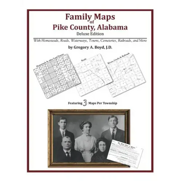 Locating original landowners in maps has never been an easy task-until now. This volume in the Family Maps series contains newly created maps of original landowners (patent maps) in what is now Pike County, Alabama, gleaned from the indexes of the U.S. Bureau of Land Management. But it offers much more than that. For each township in the county, there are two additional maps accompanying the patent map: a road map and a map showing waterways, railroads, and both modern and many historical city-centers and cemeteries. Included are indexes to help you locate what you are looking for, whether you know a person's name, a last name, a place-name, or a cemetery. The combination of maps and indexes are designed to aid researchers of American history or genealogy to explore frontier neighborhoods, examine family migrations, locate hard-to-find cemeteries and towns, as well as locate land based on legal descriptions found in old documents or deeds. The patent-maps are essentially plat maps but instead of depicting owners for a particular year, these maps show original landowners, no matter when the transfer from the federal government was completed. Dates of patents typically begin near the time of statehood and run into the early 1900s. 324 pages with 77 total maps What's Mapped in this book (that you'll not likely find elsewhere) . . . 6727 Parcels of Land (with original landowner names and patent-dates labeled in the relevant map) 101 Cemeteries plus . . . Roads, and existing Rivers, Creeks, Streams, Railroads, and Small-towns (including some historical), etc. What YEARS are these maps for? Here are the counts for parcels of land mapped, by the decade in which the corresponding land patents were issued: DecadeParcel-count 1820s124 1830s1876 1840s546 1850s3337 1860s350 1870s23 1880s141 1890s174 1900s147 1910s9 What Cities and Towns are in Pike County, Alabama (and in this book)? Allred, Ansley, Antioch, Baltic, Banks, Briar Hill, Brundidge, Buckhorn, Catalpa, Centre Ridge (historical), China Grove, Colina, Corcoran, Curry, Dunn, Enon, Ezell, Friendship, Good Hope, Goshen, Hallsville, Hamilton Crossroads, Henderson, Hephzibah, Jonesville, Josie, Kent, Lees Park, Lewis, Linwood, Little Oak, Logton, McClure Town, Meeksville, Monticello, Mossy Grove, Needmore, Olustee, Orion, Palmyra, Pleasant Hill, Pleasant Ridge, Pronto, Richland, Saco, Sanders Hill, Sandfield, Shady Grove, Shellhorn, Shiloh, Spring Hill, Stills Crossroads, Tarentum, Tennille, Thomas Crossroad, Troy, Wingard, Youngblood