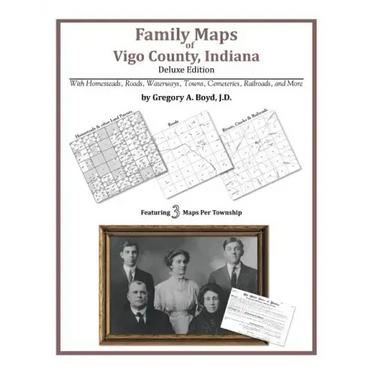 188 pages with 47 total maps Locating original landowners in maps has never been an easy task-until now. This volume in the Family Maps series contains newly created maps of original landowners (patent maps) in what is now Vigo County, Indiana, gleaned from the indexes of the U.S. Bureau of Land Management. But it offers much more than that. For each township in the county, there are two additional maps accompanying the patent map: a road map and a map showing waterways, railroads, and both modern and many historical city-centers and cemeteries. Included are indexes to help you locate what you are looking for, whether you know a person's name, a last name, a place-name, or a cemetery. The combination of maps and indexes are designed to aid researchers of American history or genealogy to explore frontier neighborhoods, examine family migrations, locate hard-to-find cemeteries and towns, as well as locate land based on legal descriptions found in old documents or deeds. The patent-maps are essentially plat maps but instead of depicting owners for a particular year, these maps show original landowners, no matter when the transfer from the federal government was completed. Dates of patents typically begin near the time of statehood and run into the early 1900s. What's Mapped in this book (that you'll not likely find elsewhere) . . . 2652 Parcels of Land (with original landowner names and patent-dates labeled in the relevant map) 51 Cemeteries plus . . . Roads, and existing Rivers, Creeks, Streams, Railroads, and Small-towns (including some historical), etc. What YEARS are these maps for? Here are the counts for parcels of land mapped, by the decade in which the corresponding land patents were issued: DecadeParcel-count 1810s165 1820s110 1830s1985 1840s321 1850s53 1870s1 1890s5 1910s1 1920s9 1940s2 What Cities and Towns are in Vigo County, Indiana (and in this book)? Allendale, Atherton, Barnhart Town, Blackhawk, Brown Jug Corner, Burnett, Cherryvale, Coal Bluff, Cobb, Deming Park, Deming Woods, Dewey, Duane Yards, East Glenn, Ehrmandale, Ferguson Hill, Fontanet, Glen Ayre, Glenn Ayr, Gospel Grove, Grange Corner, Harrison, Hickory Island, Hutton, Keller, Larimer Hill, Lewis, Libertyville, Liggett, Marion Heights, Markles, New Goshen, North Terre Haute, Otter Creek Junction, Parkview, Pimento, Pine Ridge, Prairie Creek, Prairieton, Preston, Riley, Saint Mary-of-the-Woods, Sandcut, Sandford, Seelyville, Shepardsville, Shirkieville, Southwood, Spelterville, Spring Hill, State Line, Swalls, Tabertown, Taylorville, Tecumseh, Terre Haute, Terre Town, Toad Hop, Twelve Points, Vigo, West New Goshen, West Terre Haute, Whitcomb Heights, Woodgate, Youngstown