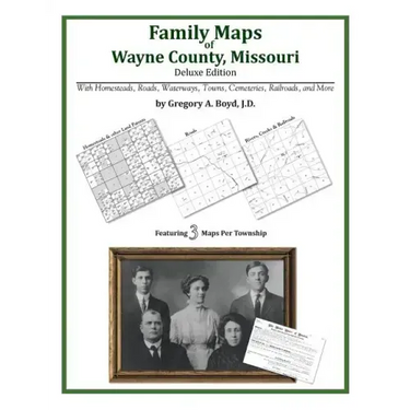 342 pages with 86 total maps Locating original landowners in maps has never been an easy task-until now. This volume in the Family Maps series contains newly created maps of original landowners (patent maps) in what is now Wayne County, Missouri, gleaned from the indexes of the U.S. Bureau of Land Management. But it offers much more than that. For each township in the county, there are two additional maps accompanying the patent map: a road map and a map showing waterways, railroads, and both modern and many historical city-centers and cemeteries. Included are indexes to help you locate what you are looking for, whether you know a person's name, a last name, a place-name, or a cemetery. The combination of maps and indexes are designed to aid researchers of American history or genealogy to explore frontier neighborhoods, examine family migrations, locate hard-to-find cemeteries and towns, as well as locate land based on legal descriptions found in old documents or deeds. The patent-maps are essentially plat maps but instead of depicting owners for a particular year, these maps show original landowners, no matter when the transfer from the federal government was completed. Dates of patents typically begin near the time of statehood and run into the early 1900s. What's Mapped in this book (that you'll not likely find elsewhere) . . . 6186 Parcels of Land (with original landowner names and patent-dates labeled in the relevant map) 95 Cemeteries plus . . . Roads, and existing Rivers, Creeks, Streams, Railroads, and Small-towns (including some historical), etc. What YEARS are these maps for? Here are the counts for parcels of land mapped, by the decade in which the corresponding land patents were issued: DecadeParcel-count 1820s14 1830s127 1840s171 1850s4006 1860s989 1870s89 1880s32 1890s365 1900s312 1910s61 1920s1 1930s3 1940s1 1960s3 1980s4 1990s1 What Cities and Towns are in Wayne County, Missouri (and in this book)? Arab, Barlow (historical), Beckville, Bounds, Browns Crossing, Brunot, Bull Run Camp, Burbank, Burch, Cascade, Chaonia (historical), Chilton (historical), Clubb, Coldwater, Damon, Dees Town, Ferrys (historical), Gads Hill, Gaylor, Gravelton, Greenville, Head Ford (historical), Hiram, Holliday Landing, Keener Cave, Kerrigan (historical), Kime, Ladero, Leeper, Lodi, Lost Creek Landing, Lowndes, McGee, Mill Spring, Missionary Acres, Old Greenville (historical), Patterson, Piedmont, Platow, Rings, Shook, Silva, Taskee Station (historical), Upalika, Virginia Settlement, Wappapello, Williamsville