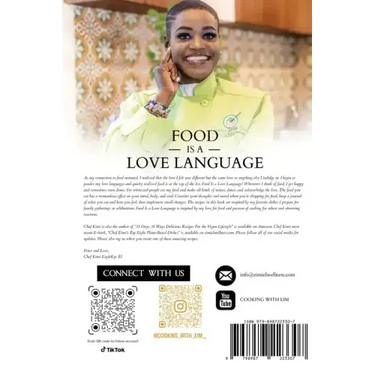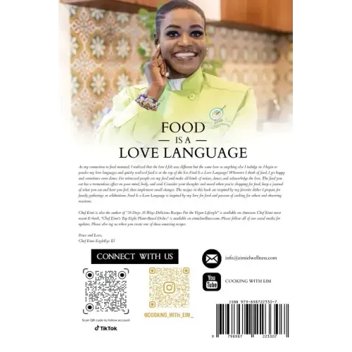 The plant-based recipes in this cookbook include Chef Eimi's favorite plant-dishes you expect at family gatherings or celebrations. As my connection to food matured, I realized that the love I felt was different but the same love as anything else I indulge in. I begin to ponder my love languages and quickly realized food is at the top of the list. Food is a love language! Whenever I think of food, I get happy, and sometimes even dance. I have witnessed people eating my food make all sorts of noises, dance, and acknowledge the love. The food you eat has a tremendous effect on your mind, body, and soul. Consider your thoughts and mood when you're shopping for food, keep a journal of what you eat and how you feel, then implement small changes. Food is a love language is inspired by my love and passion of cooking for others and observing reactions to plant-based comfort food