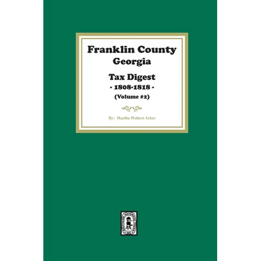 By: Martha Acker, Pub. 1981, 316 pages, Index, Hard cover, ISBN #978-1-63914-227-9. Franklin County was created in 1784 and was considered the 8th county of the state. It is located in the northeastern portion of the state boarding South Carolina along the Savannah River. Early on, Franklin County boarded Wilkes and Greene Counties, Georgia and Pendleton District/County, South Carolina. Franklin County is the parent county in part or whole to: Banks, Barrow, Clarke, Hart, Jackson, Madison, Oconee, and Stephens. Tax Digest can be one of the most valuable tools available to researchers. When used carefully along with deeds and other legal records, one can construct a rather tight framework around an inhabitant of a given area. They are particularly useful in differentiating between person with identical names in the same area, and in pinpointing the time of their coming and going. Important relationships between persons listed in a tax digest can often be established. Considering that Franklin County has lost its 1790, 1800 and 1810 census, these tax digests help bridge that gap in placing a person in a specific time, city or tax district. Information that can be gleaned from these records: name of owner, name of executor or guardian, name of adjoining land owners, number of acres, number of dwellings, value of property, city located in or name of closest creek or river, number of slaves and sometimes giving slaves name, indication of out of state ownership or a resident, or whether it is a poll tax for a person claiming no property and whether the tax payer is a defaulter or not. The index for this book has approximately 15,000 entries plus a place name index.