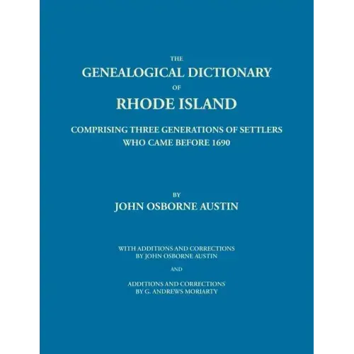 This legendary work consists of alphabetically arranged genealogical tables of approximately 500 Rhode Island families, representing thousands of descendants of pre--1690 settlers, all carried to the third generation, and some--about 100 families-- carried to the fourth. The majority of the entries contain records of births and, in all but the last generation, marriages, deaths, and places of residence, with excerpts from wills and deeds and other court records. Our reprint contains the following added material: (1) additions and corrections consisting of 104 pages by G. Andrews Moriarty; (2) manuscript notations and marginalia in various hands, including cross-references to material in "The American Genealogist"; and (3) a Foreword by Albert T. Klyberg, director of the Rhode Island Historical Society.