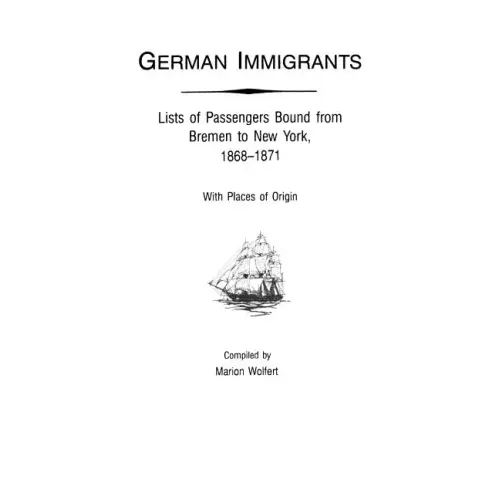 Following the death of her collaborator Gary Zimmerman, Marion Wolfert carried on with the German Immigrants series, providing us with the fourth volume. Similar in all other respects to the previous volumes in the series, this volume spans the period 1868-1871 and identifies 32,000 German passengers bound from Bremen to New York about whom a specific place of origin is noted in the manifests. For convenience, immigrants' names are arranged in alphabetical order, and family members are grouped together, usually under head of household. In addition, details concerning age, place of origin, date of arrival, and name of ship are provided, as are specific citations to the original source material.