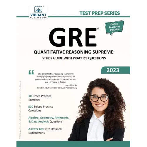 GRE Quantitative Reasoning Supreme: Study Guide with Practice Questions includes 520 Quantitative Reasoning questions and 10 timed tests that cover the core topics in Arithmetic, Algebra, Geometry, and Data Analysis. Each section comes with an introductory overview that includes solved examples and practice questions. With this GRE practice book, learners have the opportunity to solve GRE-type questions, including Quantitative Comparison, Multiple Choice Single Answer, Multiple Choice Multiple Answer, Data Analysis, and Numeric Entry that appear in the quantitative reasoning section of the GRE. This book will help learners to practice in simulated GRE test conditions, thus familiarizing them with the format and flow of the quantitative reasoning section.