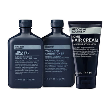 Trio of our Barber-Created The Best Shampoo, You Need Conditioner and Some Hair Cream guarantees healthier and better looking locks for less. It's $10 less than if purchased individually... to split hairs. A great kit for holding onto the hair a guy has and making it look and feel its absolute best.
