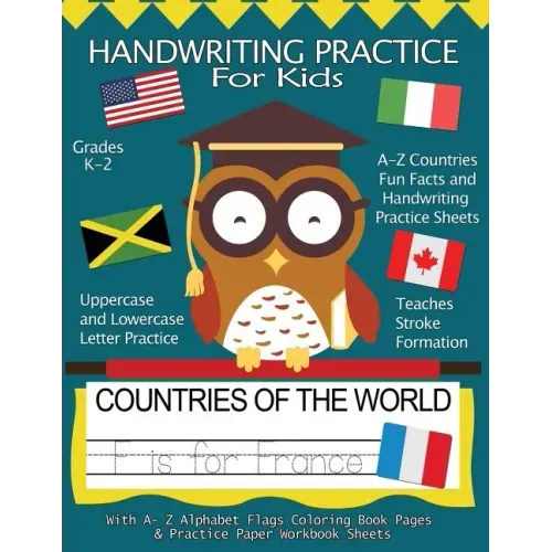 Handwriting Practice For Kids Workbook is designed to givew your children a head start. This is the Countries Alphabet Letters edition, Packed with handwriting practice papers, a word search puzzle, useful facts about the countries and lots of handwriting practice paper at the back . Everything covered from A-Z letters, both upper and lower case for kids to trace. Suitable for Pre-K and Kindergarten with some pages with challenging words that are good for kids age 2-4 or even 3-5 too. Get them started young and they will not only master these words, they will larn all about the countries with facts about language, size, population, culture, currency and a range of other useful country facts. There are also lots of blank pages contained within this handwriting letter tracing workbook so that children can write their own words too. A4 size, 8.5 x 11" so lots of space for little hands to write. Cute teacher owl cover, part of the Handwriting Practice Books series, don't forget to check the others out for a complete learning experience for your child. Order your copy of the Countries Alphabet Letters edition of the Handwriting Practice for Kids workbook today.