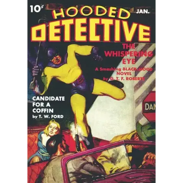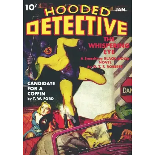 This issue of HOODED DETECTIVE features the Black Hood novel "The Whispering Eye," by G.T. Fleming-Roberts. ("Hunted by the police . . . framed for robbery and murder by the Eye, master viend and vicious ruler of the underworld . . . loathed by Barbara Sutton, the girl who loves him . . . the Black Hood had to face the blazing purgatory of this murder master's guns to win back Barbara's love and clear himself of the framed charges ) Also features six action-packed short stories: "Candidate for a Coffin," by T.W. Ford; "One Hundred Bucks per Stiff," by J. Lloyd Conrich; "Death is Deaf," by Cliff Campbell; "Three Guesses," by David Goodis; "The Cop was a Coward," by Wilbur S. Peacock; and "Dinner Date with Murder," by Harry Stein. Also includes two true fact detective shorts, "The Strange Case of William Long," by Roy Giles, and "Artistic Murders Misfire," by Mat Rand.