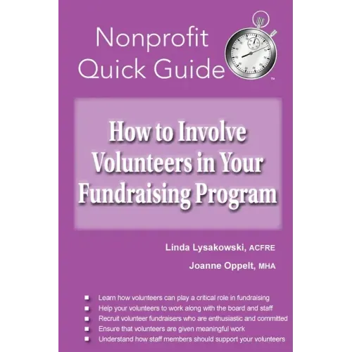 How to Involve Volunteers in Your Fundraising Program is written for busy executive directors, development professionals, and board members who want to maximize fundraising reach and effectiveness by harnessing the incredible power of volunteers. As a Nonprofit Quick Guide(TM), you can read it in one sitting or grab a few chapters over lunch. More importantly, it gives you practical advice that you can easily implement without spending a ton of money.