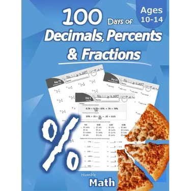 100 days of practice problems for decimals, percents, and fractions. This is not an entry level book. Students will need basic understanding of what fractions and decimals are. This book focuses on converting between fractions, decimals, and percentages. It also teaches students how to add, subtract, multiply, and divide decimals and fractions.