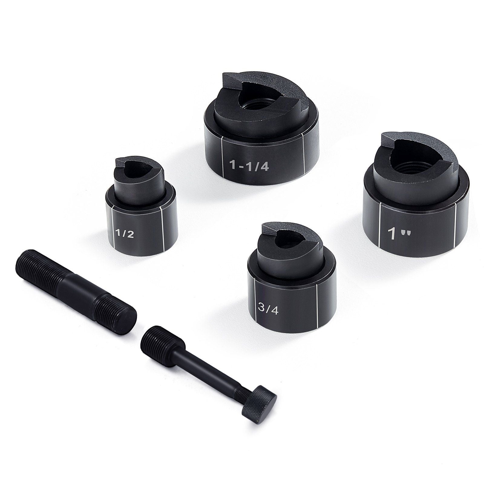 There are 4 sets of dies and punches, including 1/2", 3/4", 1, and 1-1/4", for drilling both large-diameter and small-diameter holes.